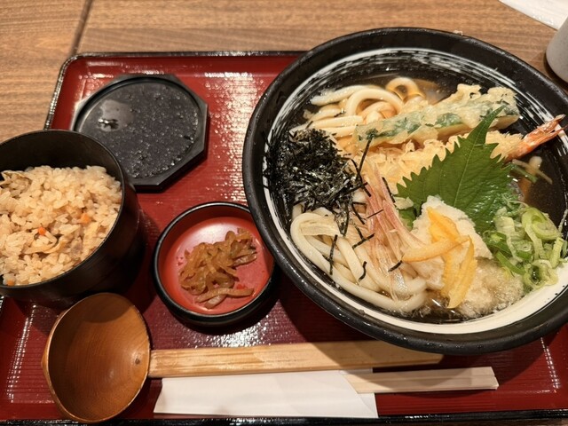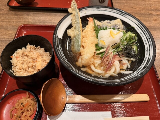 オーダーしたのは、もちろんかつ丼定食。無料でうどん半玉増量してもらい、税込で1240円。トッピングに揚げ(税込250円)を選び、きつねうどんにしてみました。