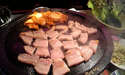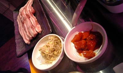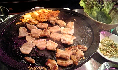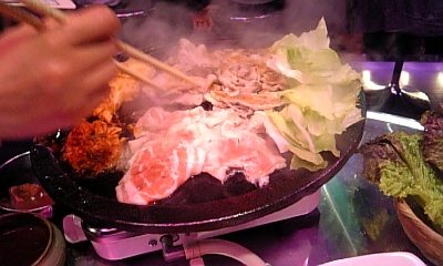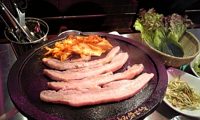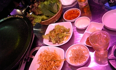 サンチュ、エゴマの葉、ニンニク、唐辛子、焼きキムチなど