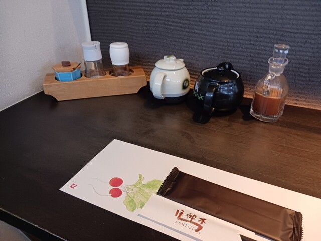 テーブルにポン酢の効いたドレッシングとソース(甘口、辛口)塩3種類(パキスタン塩、柚子七味塩、黒胡椒チーズ塩)が置いて有ります。