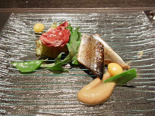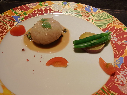 二品目は蓮餅風のヴァプールと季節野菜を白胡麻のヴィネグレットソースでいただく。ヴァプールとは、蒸し物。いわゆる蓮根饅頭だと店員さんが解説してくれた。