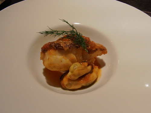 真鯛とムール貝のポルトガル風ブレゼ。ブレゼとは、蒸し煮。メニューでは鱸(すずき)だったのだけれど、台風の影響で手に入らなかったらしく、真鯛に変更されていた。ムール貝とともにトマトソースと一緒に蒸されていて、これもおいしい〜♪