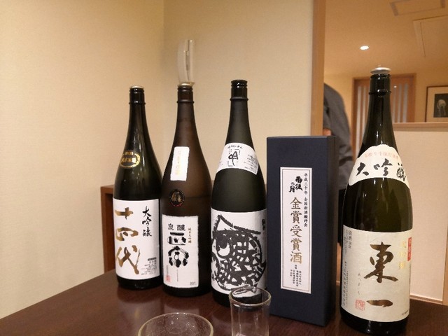 黒龍の「龍」、鍋島、而今、夢許美丈夫といいお酒が並ぶ。端から順番やな。