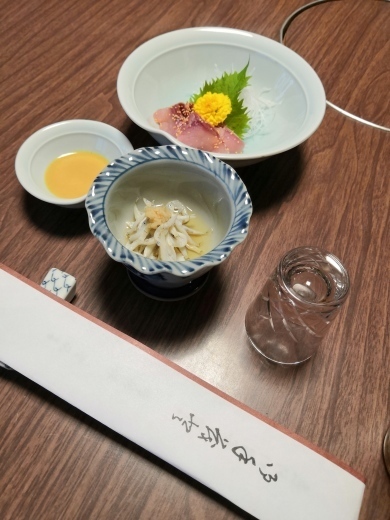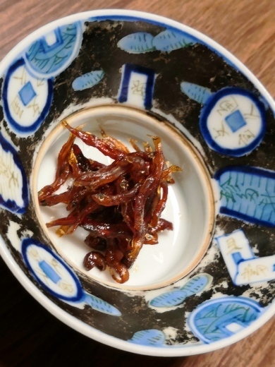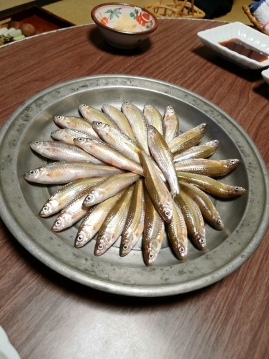 鮎の稚魚ヒウオ。白くて柔らかい。飴煮のようなのは食べることがあるけれど、こういうのは食べたことがない。酢でさっぱりと。