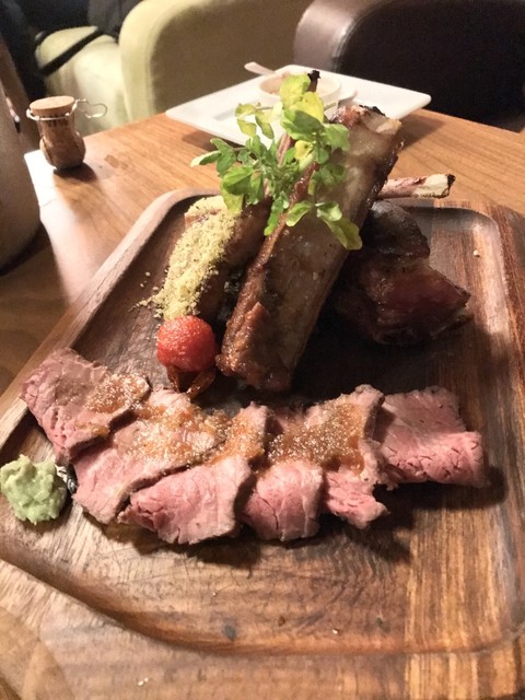 ローストビーフ、スペアリブ、ラムチョップの3点盛りで、ギャートルズのように貪り食う(^^;