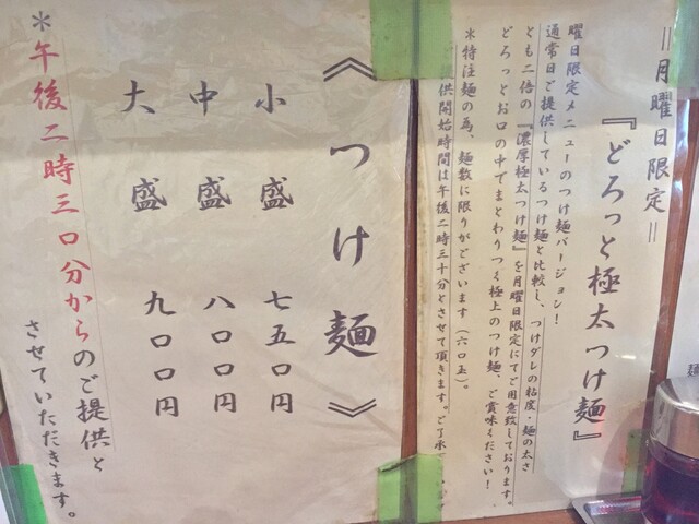 月曜日14時半以降提供の「どろっと極太つけ麺」をぜひ食べたい。。。
