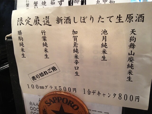 加賀鳶純米辛口生、天狗舞山廃純米生、勝駒純米生、池月純米生、竹葉純米生、と限定厳選のしぼりたて生原酒を全制覇!