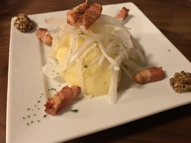 なめらかなマッシュポテトにオニオンスライスとベーコンが配され、粒マスタードで頂くというもの。