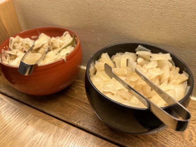 江戸前天丼(ご飯少な目)と追加したお味噌汁(カニ)を心待ちにしながら自家製のお漬物(2種)を食べしばし…