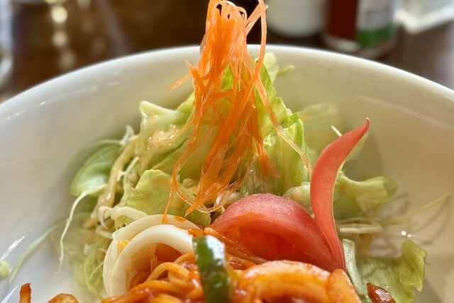 さらに、レタスとトマト、ゆで卵、ニンジンのサラダが添えられ、濃厚なナポリタンの合間に口をさっぱりと整えてくれます。