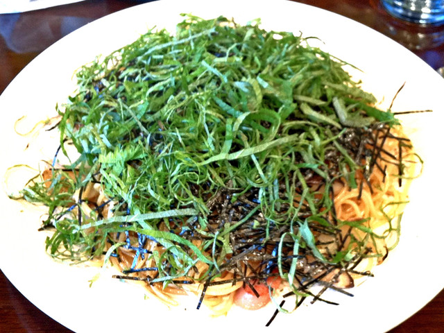 醤油ベースのスパゲティ。具はソーセージ、タマネギ、ピーマンに大量の海苔と紫蘇が覆っています。