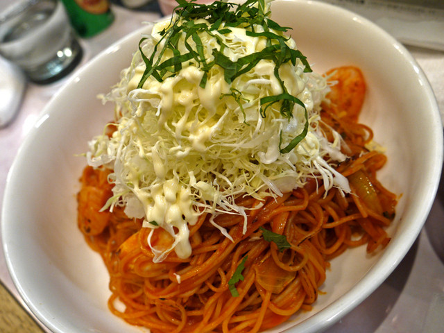 マスターは千切りに対してもこだわりがあり、包丁で切られたキャベツが盛られたナポリタン。