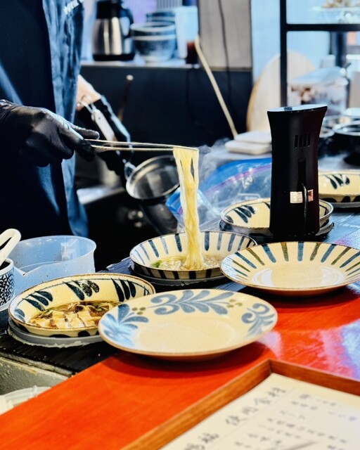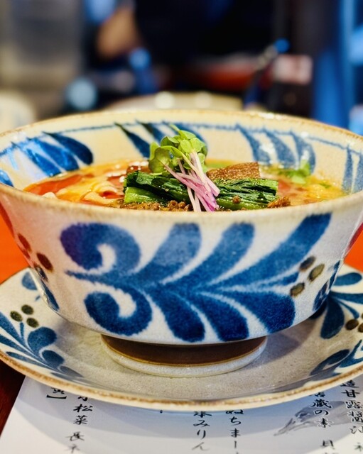 藍の筆致が走る丼に,鴨だしと胡麻の乳化したスープ,そこへ真紅の辣油が滲み込み,表面に複雑なマーブル模様をつくっている.