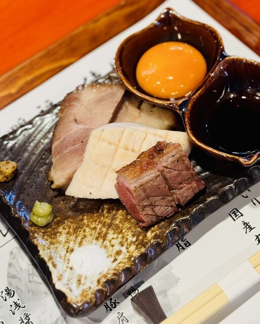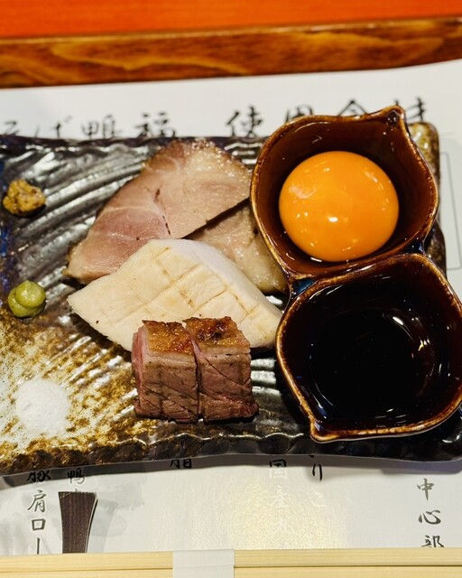 別皿で供される肉の盛り合わせも,この店らしさの象徴だ.炭火の香りをまとった鴨ロースに,異なる火入れの豚のピースを添え,塩,山葵,マスタード,卵黄,醤油ダレで自在に組み合わせていく.