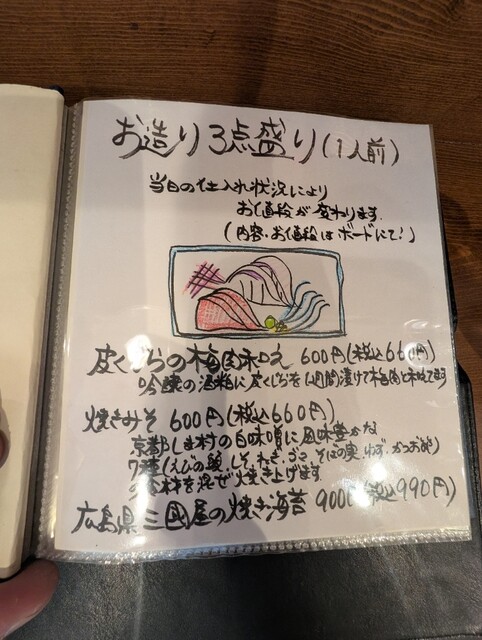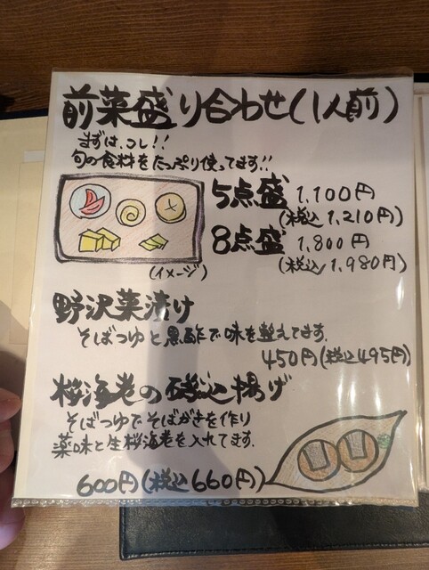 壁際に黒板があり、前菜5点盛りとお造り3点盛りの内容が記載されていた。