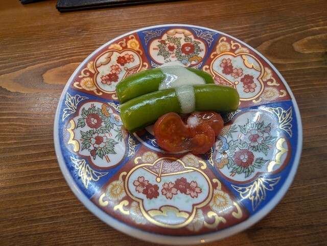お通しは、豆(スナップエンドウ?)とミニトマトのお浸しに自家製マヨネーズを添えたもの。この豆が、食材、調味ともに大変良く、あいさつ代わりのジャブでいきなり持って行かれる。