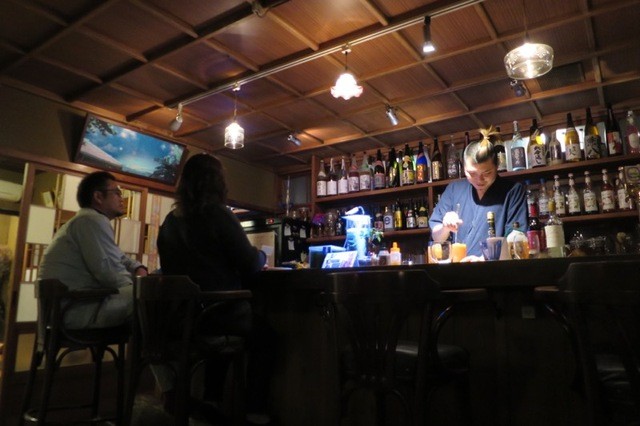 ムーディーな照明と、色々なお酒が並んだバーカウンターがあるのです。古民家の中に、こんなバーがあるとは思えない!客席はこの他に和室があって、畳に座って飲食することができます。