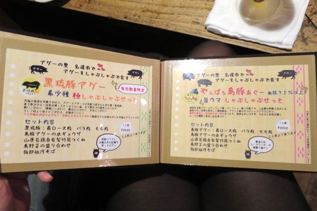 何かつまみを注文しようと、松の古民家でもメニューをチェックしてみました。松の古民家は黒琉豚アグーややんばる島豚あぐーが食べられるお店。名物はしゃぶしゃぶのようです。