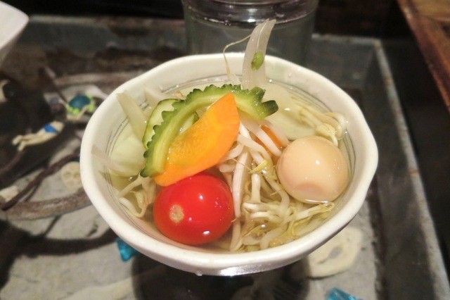 こちらは、やんばるピクルス(350円)。月替わりの自家製ピクルスだそうです。この日はゴーヤ、ニンジン、トマト、モヤシ、玉ねぎ、うずらの卵が入っていました。