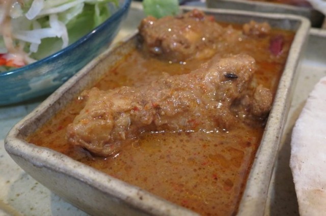 プレートの真ん中には、四角いお皿に入ったチキンカレー。手羽元がゴロンゴロンと2本入っています。