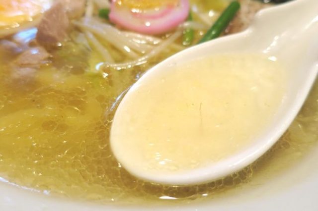 前回は濃厚をいただいたので、今回はアッサリ塩タンメンを食べてみることにしました。ビジュアル的には濃厚もアッサリ塩も似ていますが、トッピングが異なるみたい。チラガーがなくなって、ナルトの上に柚子の皮が乗せられられています。