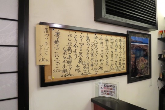 そんなん言っても名護ナイトは始まったばかり。我らを待ってる飲み屋があるはず!気を取り直して、さくさくおつまみを注文します。はなおりにはメニュー本に書かれたグランドメニューの他に、壁に貼られた本日のオススメがあるようです。これらを見て、気になったものをいくつか注文してみました。