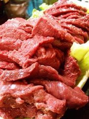 やっちゃんのナマニクは、筋がのこらないよう薄切りにしてありますが、(ひとり一切れの配分で、しばしば争奪戦に)まるいのレヴァは・・・・・・