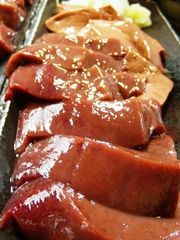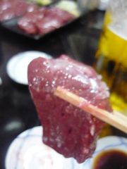 やっちゃんのナマニクは、筋がのこらないよう薄切りにしてありますが、(ひとり一切れの配分で、しばしば争奪戦に)まるいのレヴァは・・・・・・