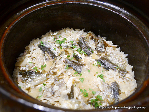 ▶ 鮎炊き込み御飯 新生姜木の芽