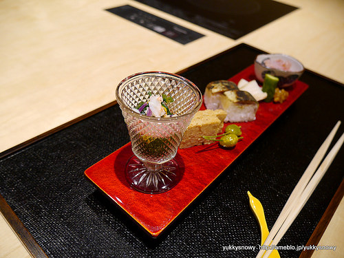 ・ 清汁仕立て かます焼き〆 薊冬瓜大根人参茗荷防風露生姜