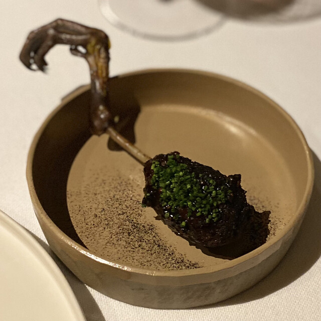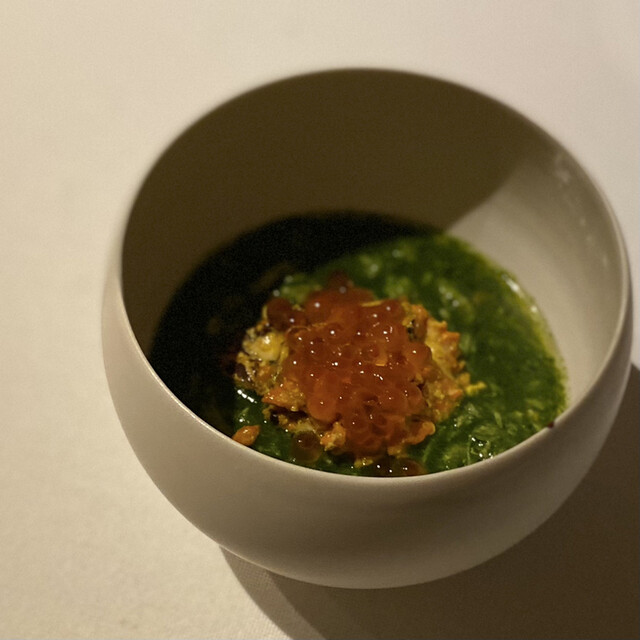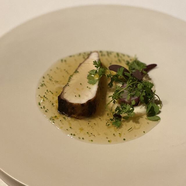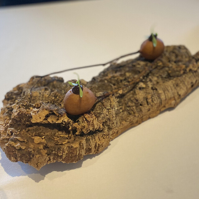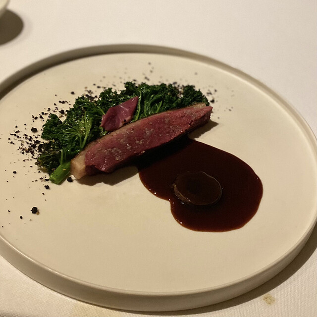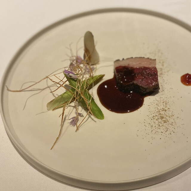 ”命をいただく”という感謝の意味も込めたイノシシのリエットから始まり、スペシャリテのボタンエビも含めスタートはほぼいつも同じだけど、それ以降はこごみやうるい、タラノメなど旬の山菜をたっぷり使ったお料理に。真鯛とこごみはクリームのソースが優しくまとめ、猪は苦味のあるしどけを合わせ力強さを感じる1皿に。メバルのレアな火入も感動、この繊細なお料理をあのガタイのいい井上シェフが作られているというギャップがいつも面白いと感じてしまう。