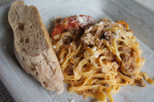 [2013.09]トマトと夏野菜のひき肉入りパスタ。平打ち麺が美味い!手造りパンも最高!