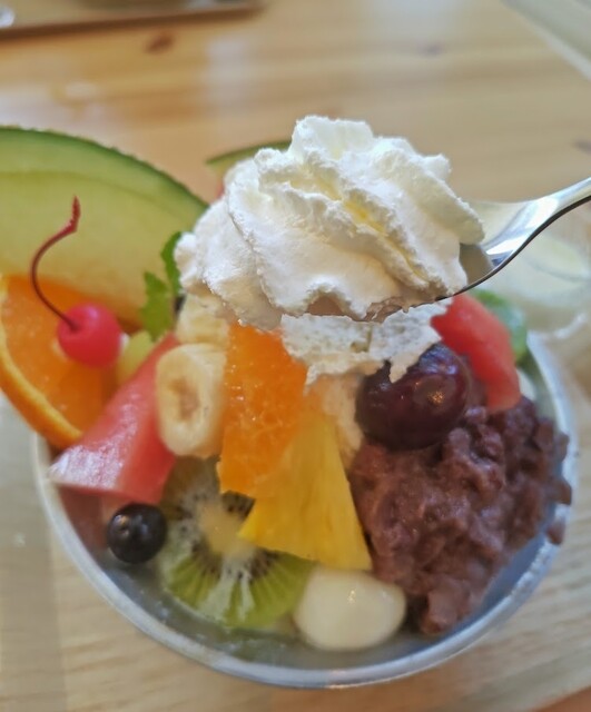 シャインマスカットも入ってて沢山の果物や白玉団子と粒あんに