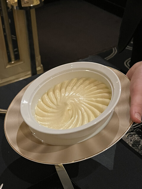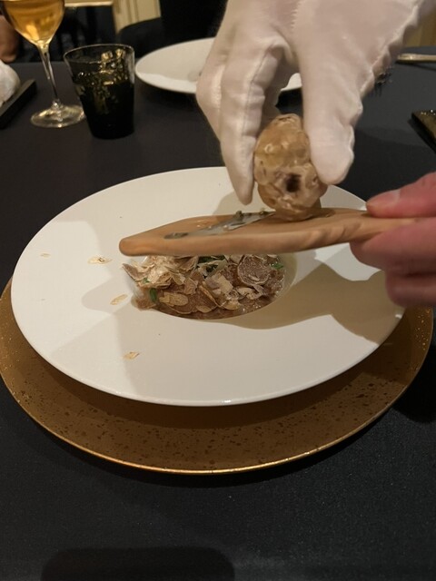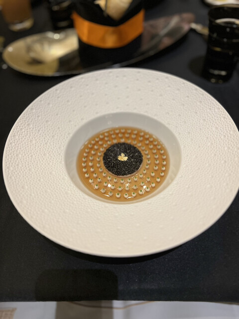 有名なコンソメの上にキャビアとピュレでドットを描いた一品をいただきたくて、ウェイターの方にメニューのどこにあるか伺ったところ、「キャビア・ アンペリアル ロブションスタイルはシェフからのサプライズとして出てきますのでご安心を」とのこと。