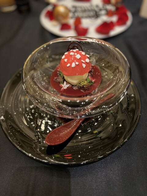 先のウェイターさんが、「男性は可愛いデザートを選びがち」と言ってましたが、きのこの形をしたデザートが登場。そのきのこにベリーのソースをかけていただきます。