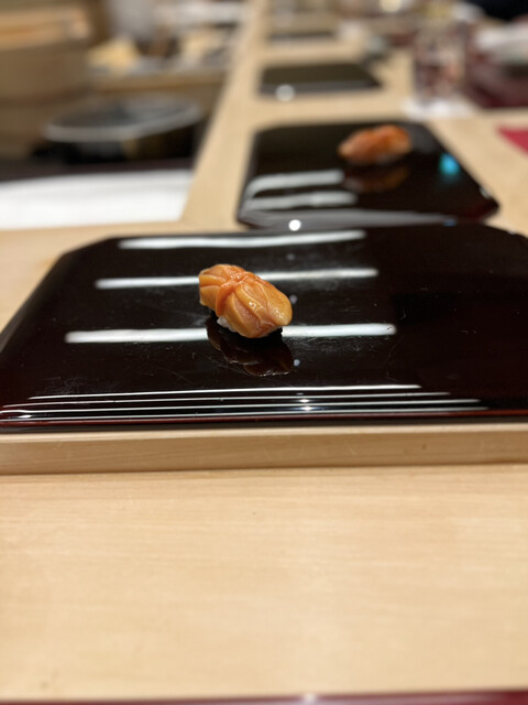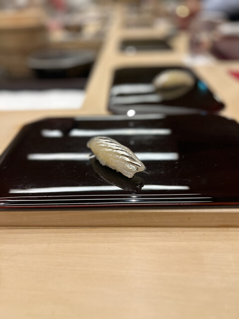 かすごはほどよく酢で締められ、淡い香りと酸味が心地よく広がる。赤貝は芳香と歯応えが見事に調和し、くるまえびはみずみずしい身の甘みが際立ち、余計な演出を加えずに素材そのものの力で語ってくる。あじは皮目の香ばしさと身の滑らかさが好対照で、包丁の入り方からも丁寧な仕事が伝わってくる。貝の握りはしっとりと煮含められた甘さが際立ち、たれの艶やかな照りも美しかった。