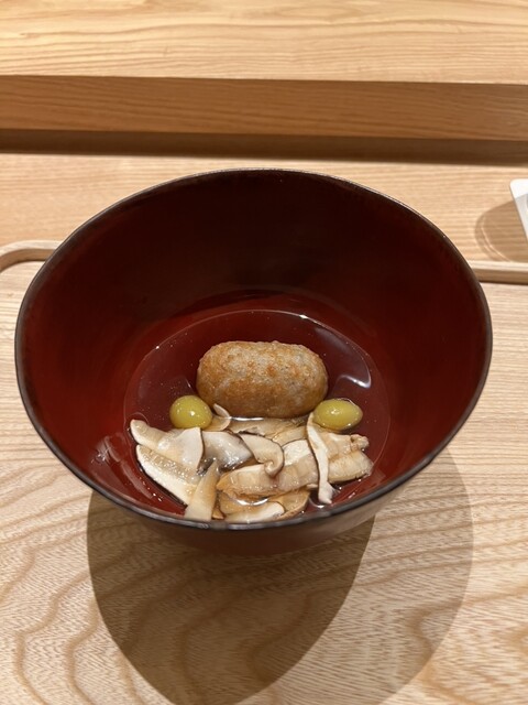 お椀:大分産のクエと松茸をすっぽん出汁で仕上げた、滋味深いお椀。クエにはしっかりと脂が乗っていて柔らかく仕上がっていました。