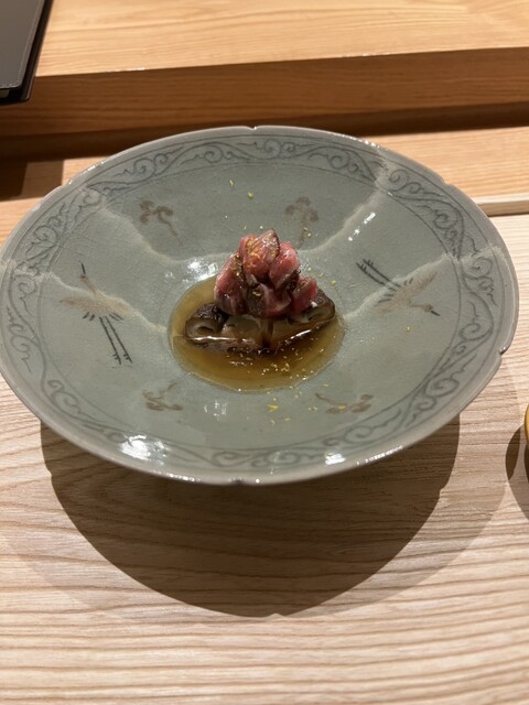 柔らかいシャトーブリアンにゴルゴンゾーラの香りをまとわせ、椎茸が和の方向へ調和させる。虎白らしいバランス感。