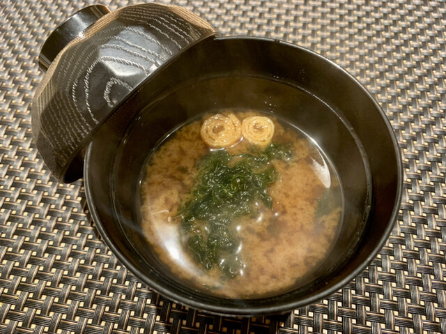 「締の汁物」あおさの赤だし、「季節の甘味」はローストピスタチオのアイスでした。