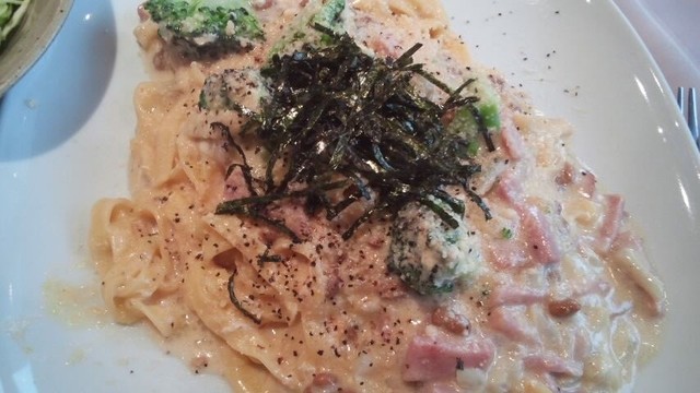 ★和風納豆カルボナーラ、サラダ(博多フードパーク 納豆家 粘ランド) :納豆がふんだんに使われているけどただの色物じゃなく料理としての質や対応もガチ!