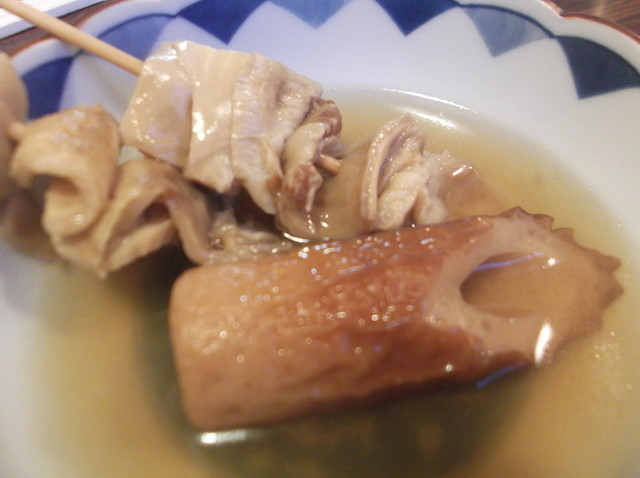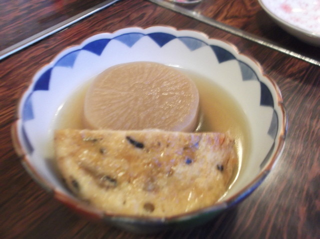 おでんを見つけ、大根 スジ肉 ちくわをもらいます。