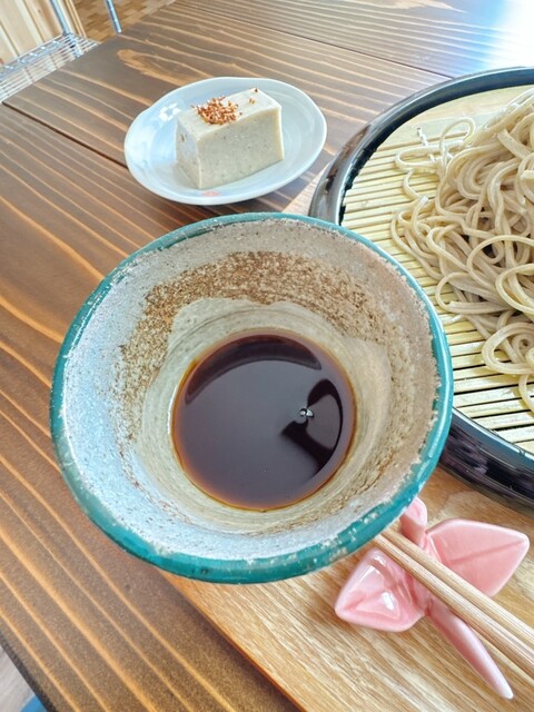 トレーには「蕎麦、徳利、猪口、薬味、箸」・・・少し遅れて「サービスです」と「蕎麦豆腐」が出される