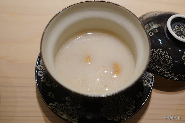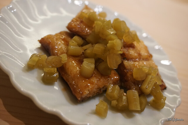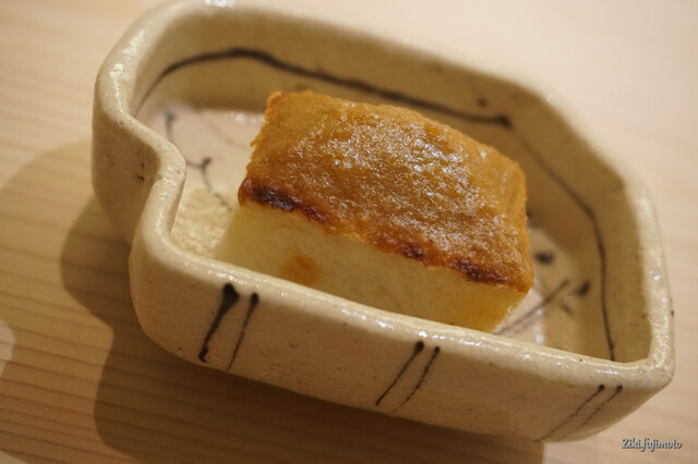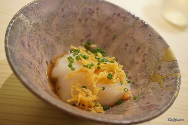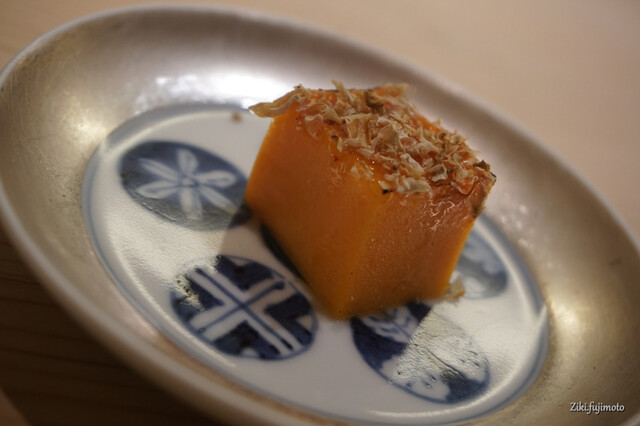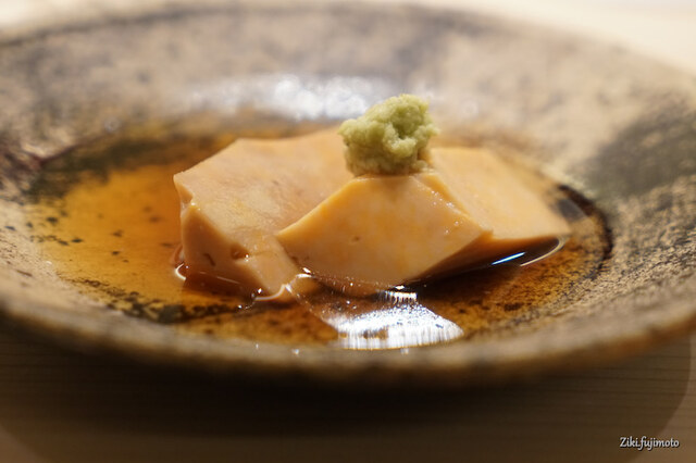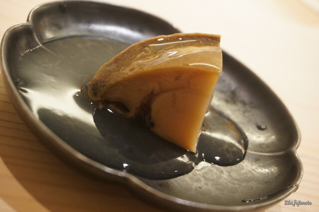 丁寧に下処理をしたものを上品な煮汁に漬け込み、客に出す直前にその表面を削り落とし、鮟肝の中心部分のみを出してくれる。