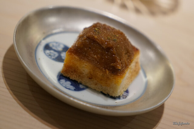 そして再び鮟肝。さきほどの鮟肝から切り落とした端切れをセロリ等の野菜と一緒に炒ってペーストにしたものを焼いたトーストに乗せたもの。ほのかに山椒を効かせている。
