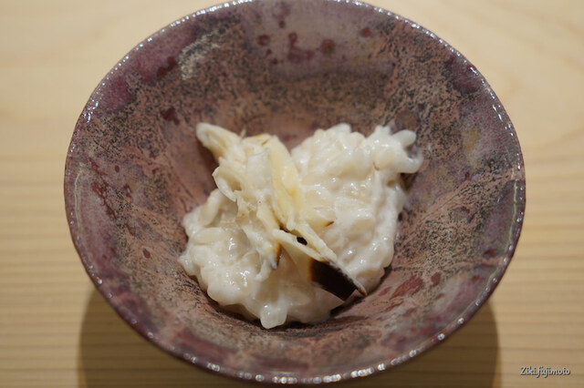 ボタン海老には、海老の卵が乗っている。卵を使うと、どうしても海老特有の臭みというのが残るのだが、海老の殻を焼いて砕いたもの等と和えたペーストにすることで、その臭みを打ち消している。