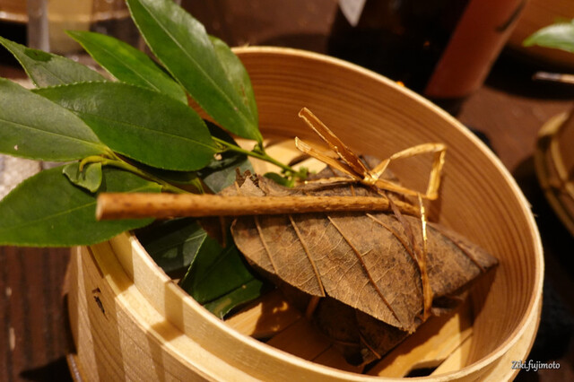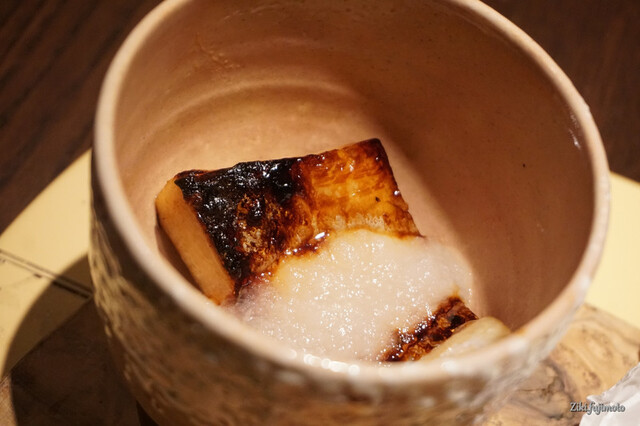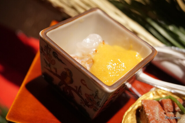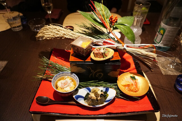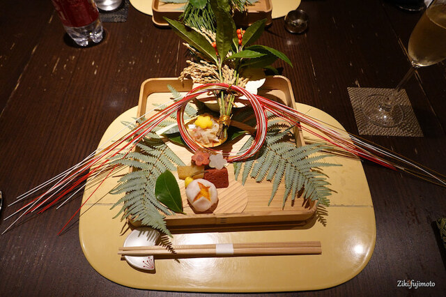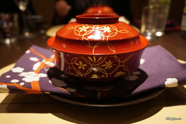 次は、お雑煮。海老芋、くわい、からすみ、きんき、蓮根もち。あしらいで、大根と人参で作られた相生結び。ちなみに、自家製のからすみは小皿に取り分けて酒のアテでいただいた(笑)