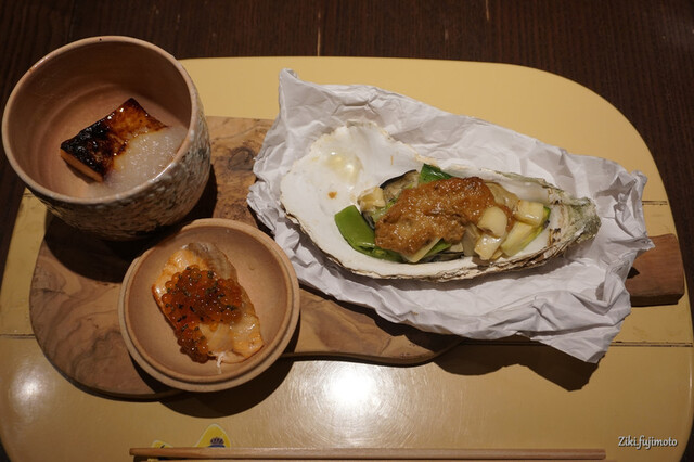 魚料理では、寒鰤の照り焼きに大根おろし、ますのすけにイクラととんぶり、牡蠣にはあん肝は味噌をといたものを乗せて焼いたもの。