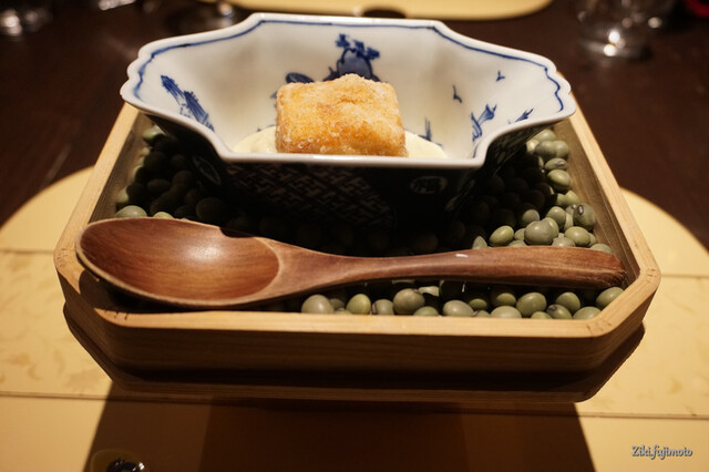 そして、定番の胡麻豆腐。下に敷かれているのは、青大豆のパンチェッタソース。