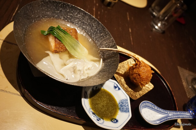 肉料理は、宮地豚。こちらは、スッポンベースに干しエビや干し貝柱で取ったスープに水餃子も入っている。