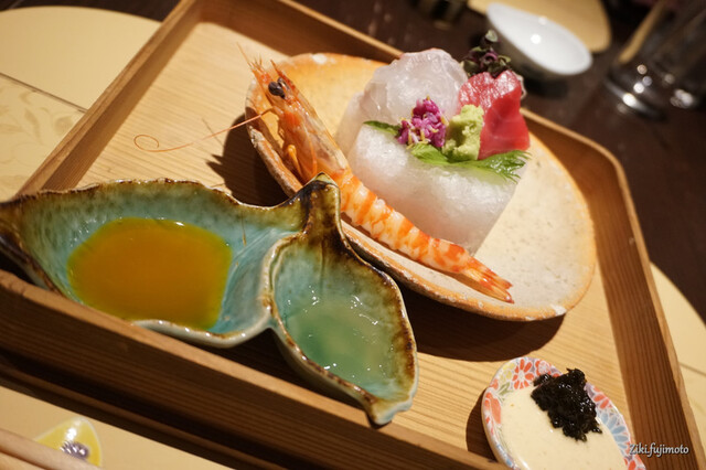 お造りには、淡路の鯛に塩釜の鮪。あと、海老。タレとして、黄身醤油に昆布出汁のジュレ、自家製マヨネーズに海苔。色々と組み合わせていただくのも、また楽しい。