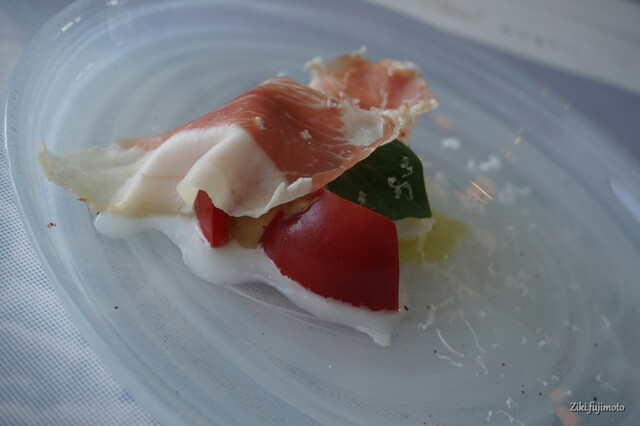 カプレーゼは、生ハム、トマト、モッツアレラチーズ。インサラータは、フルーツとハーブのサラダ。